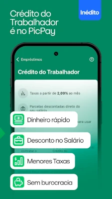 É CLT? O Picpay deixa sua vida mais tranquila! Chegou o Crédito do Trabalhador, com ele você pode acessar o empréstimo consignado privado diretamente pelo PicPay, com taxas reduzidas e desconto em folha de pagamento. Aproveite para obter crédito rápido, sem comprometer seu orçamento. Simule agora pelo app e aproveite as melhores condições para você!