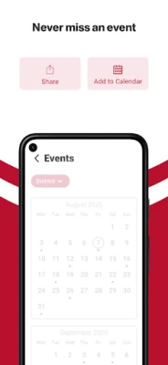 NEVER MISS AN EVENT The event section shows a list of events throughout the district. Users can add an event to your calendar to share the event with friends and family with one tap.
