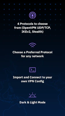• 6 secure protocols: WireGuard®, OpenVPN (UDP/TCP), IKEv2, Stealth, and Wstunnel. You can adapt for speed, stability, or stealth.