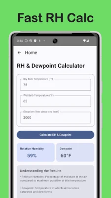 • Calculate Relative Humidity (RH) and Dewpoint from dry and wet bulb, at any elevation